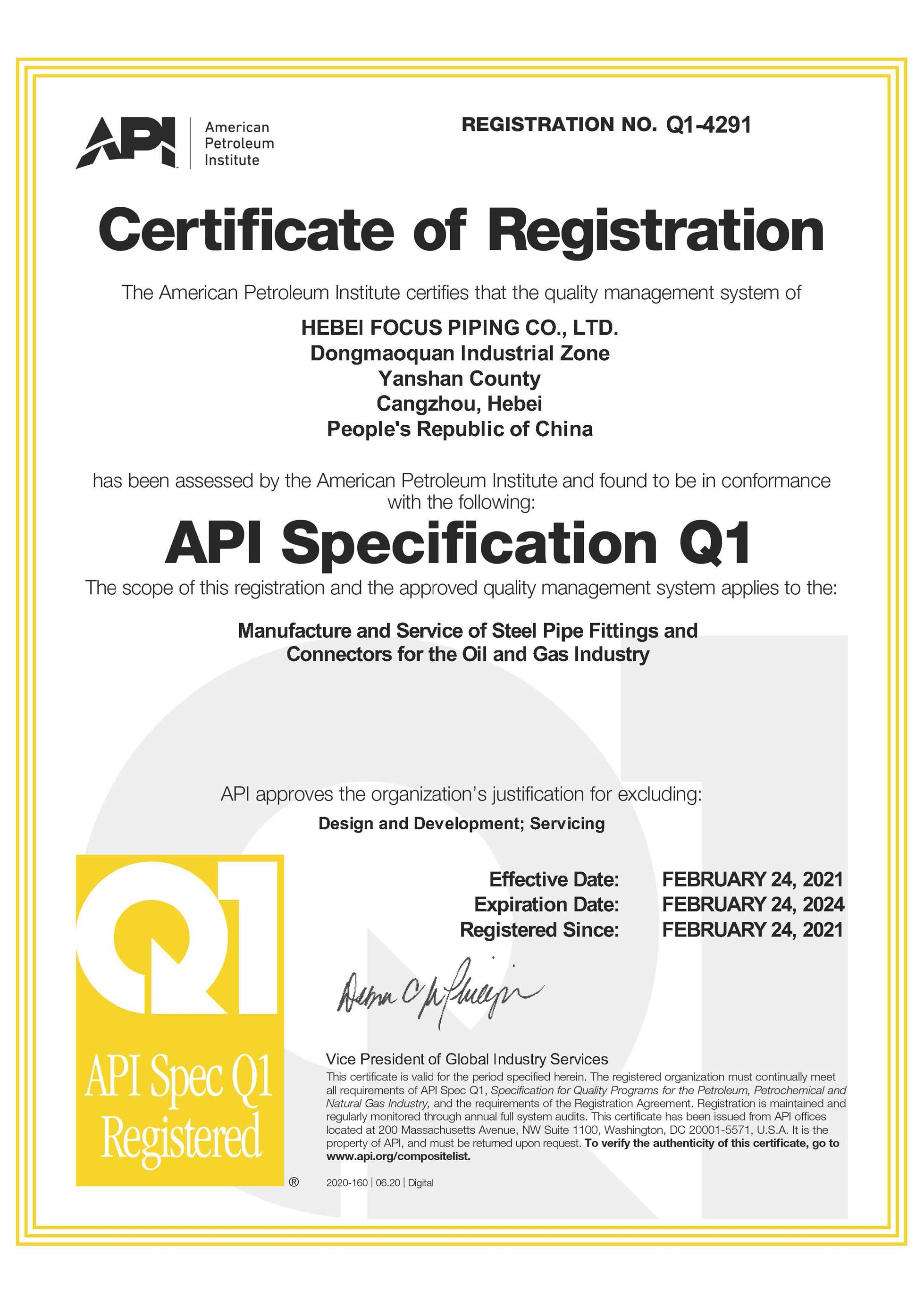 我公司通過(guò)美國(guó)石油協(xié)會(huì)API Q1認(rèn)證